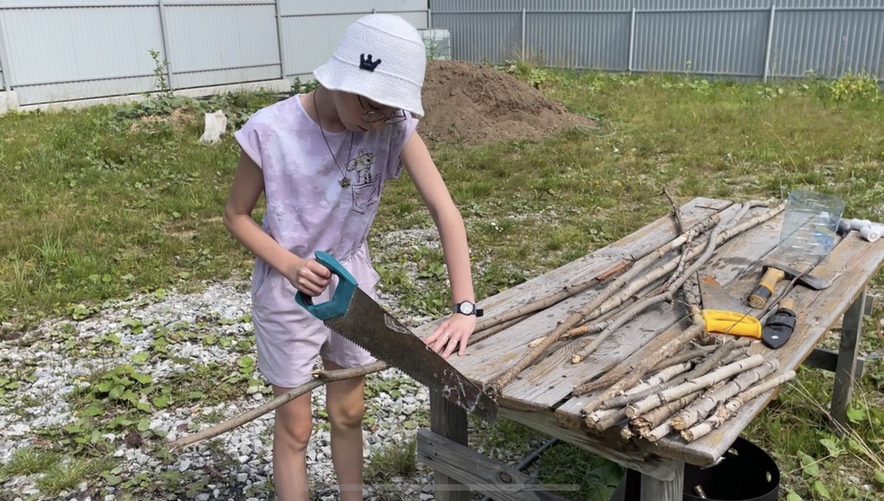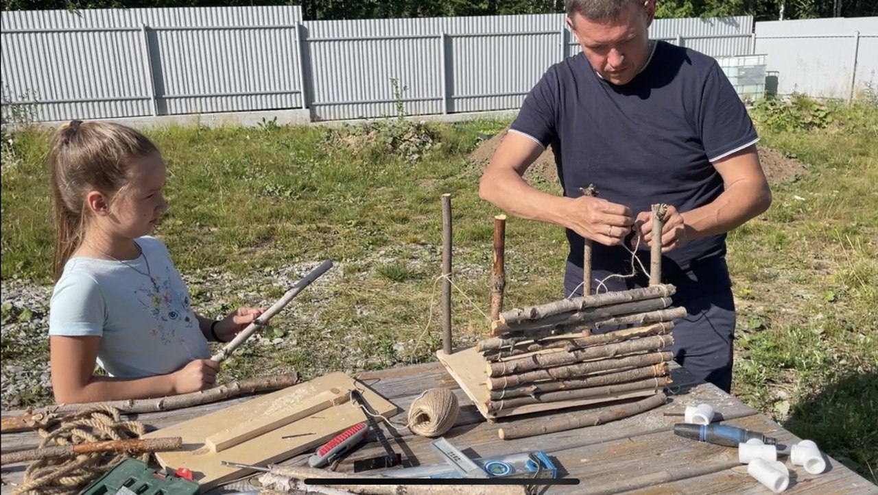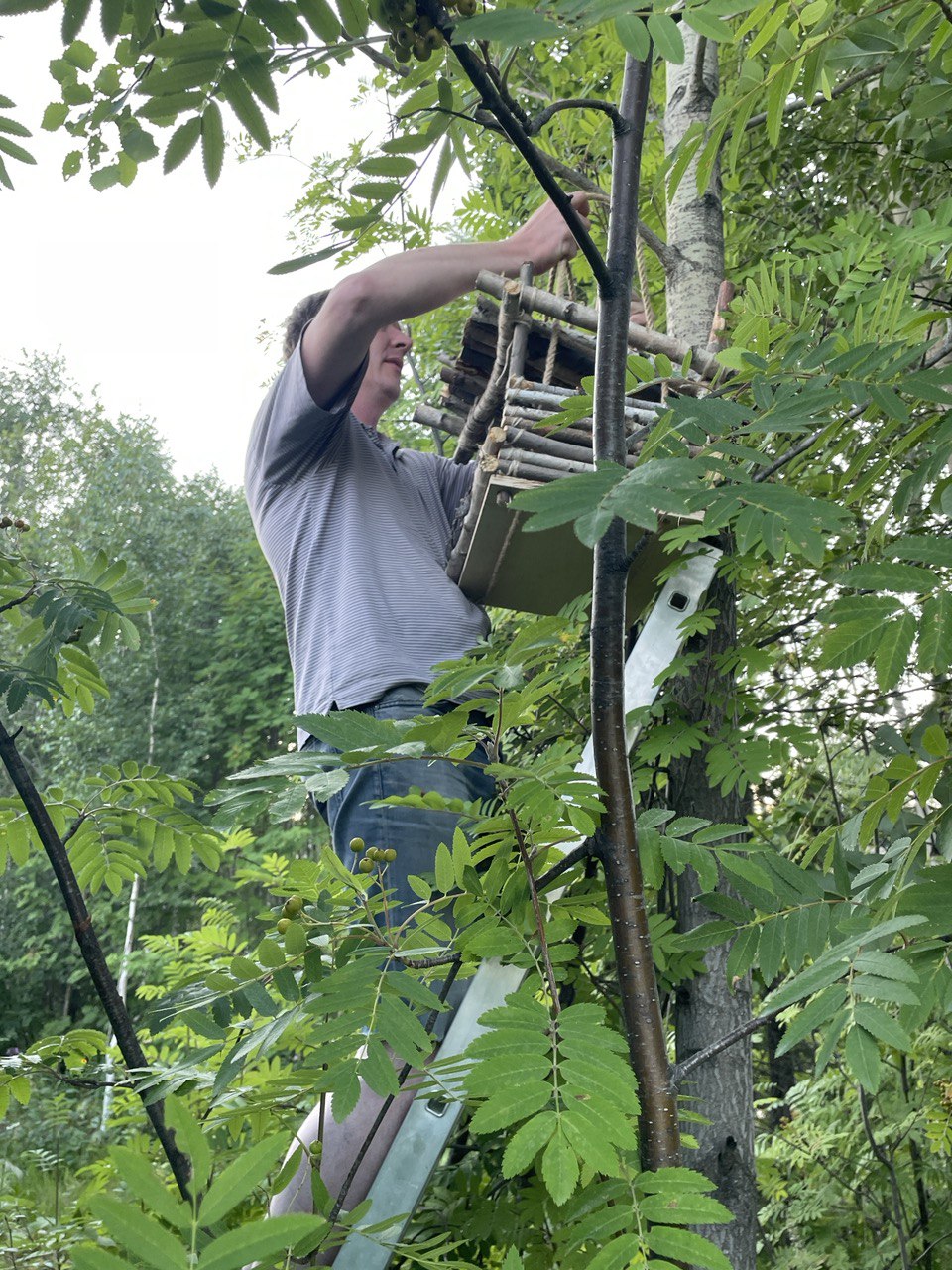 Наша старая кормушка, сделанная из веток, верой и правдой прослужила два полных сезона. Мы наблюдали за птицами, которые прилетали подкормиться, а заодно и видели, как кормушка понемногу ветшала. Но основным “разрушителем” оказались дятлы — они то и дело пробовали её на прочность своими мощными клювами! В итоге конструкция полностью пришла в негодность.