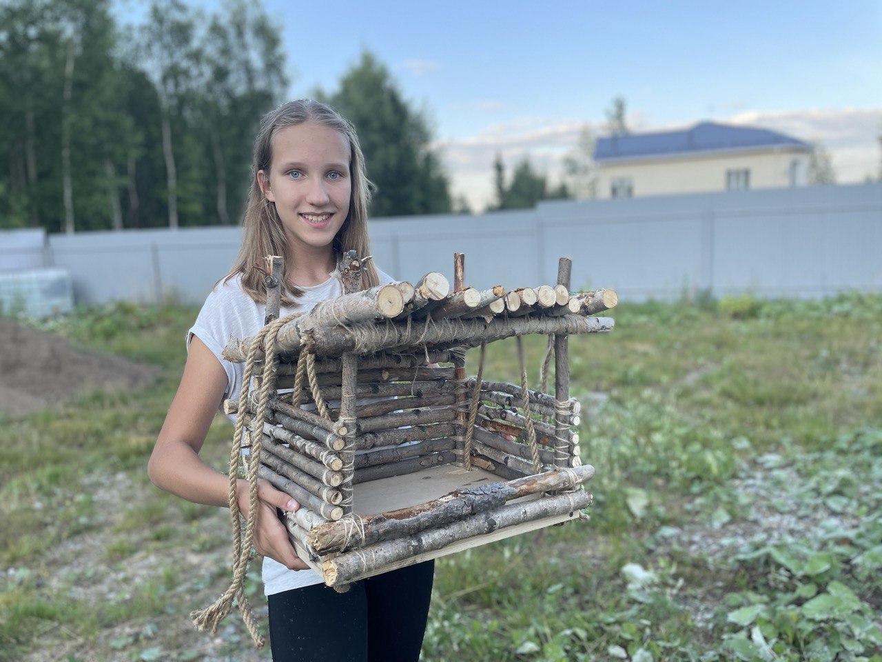 С учетом того, что мы использовали только подручный материал (ветки и пеньковую веревку), кормушка получилась самобытной и отлично вписалась в природный ландшафт.